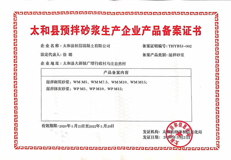 太和县恒信混凝土有限公司积极响应国家政策,全力参与绿色环保事业,不断研发新型节能环保产品服务社会,并以此作为发展方向。公司现拥有两条混凝土生产线和一条湿拌砂浆生产线,具备年产60万立方混凝土和年产20万吨湿拌砂浆的生产能力。拥有预拌混凝土资质,同时是太和县目前拥有备案许可的湿拌砂浆生产企业。