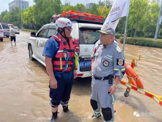 07月23日20时通过宁洛高速、安洛高速、京港澳高速,由于郑州市积水过多,无法通行。宋厂长押送防汛物资经过多次辗转,频繁绕道,历经6个多小时到达郑州市郑东新区管理委员会社会事业局。另一路,由刘小军协调组织的太和县应急志愿者和太和县电梯应急救援队约50名志愿者队员,携带橡皮艇5艘,发电机1组,无人机1台,打捞装备3套,浮力马甲50件奔赴河南重灾区新乡市进行抢险救援。