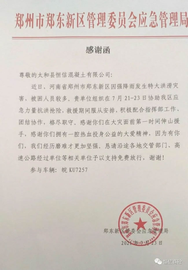 07月23日携带着太和县恒信混凝土有限公司救灾物资的车辆连夜从太和赶赴郑州,奉献出全体员工的爱心真情。